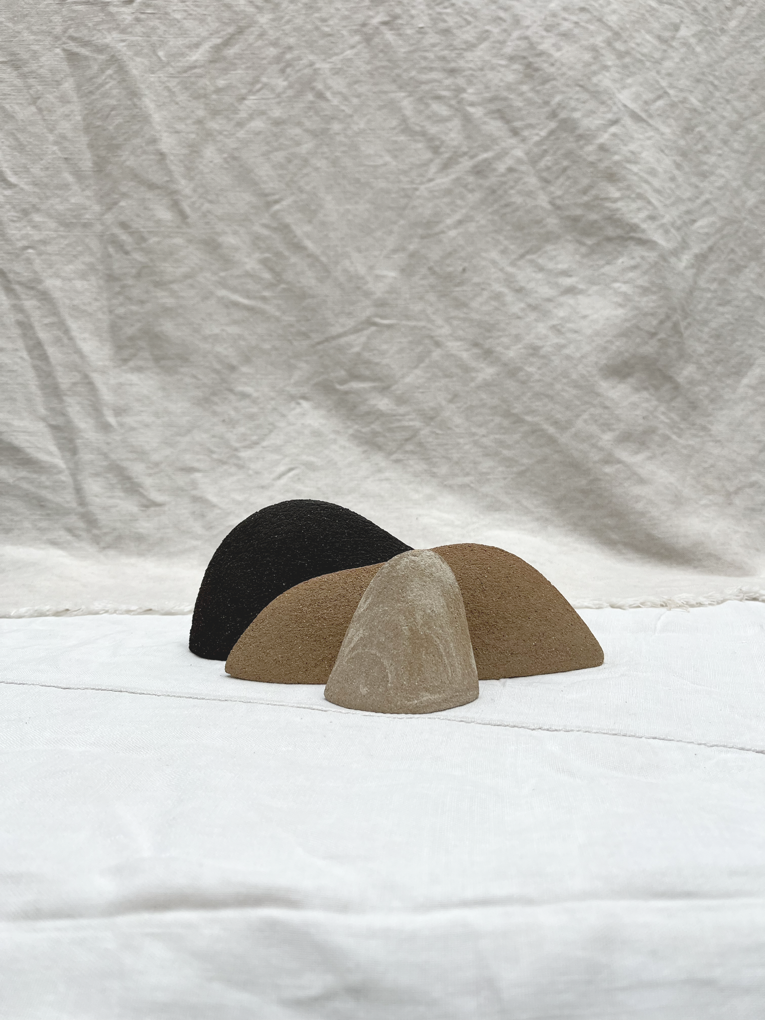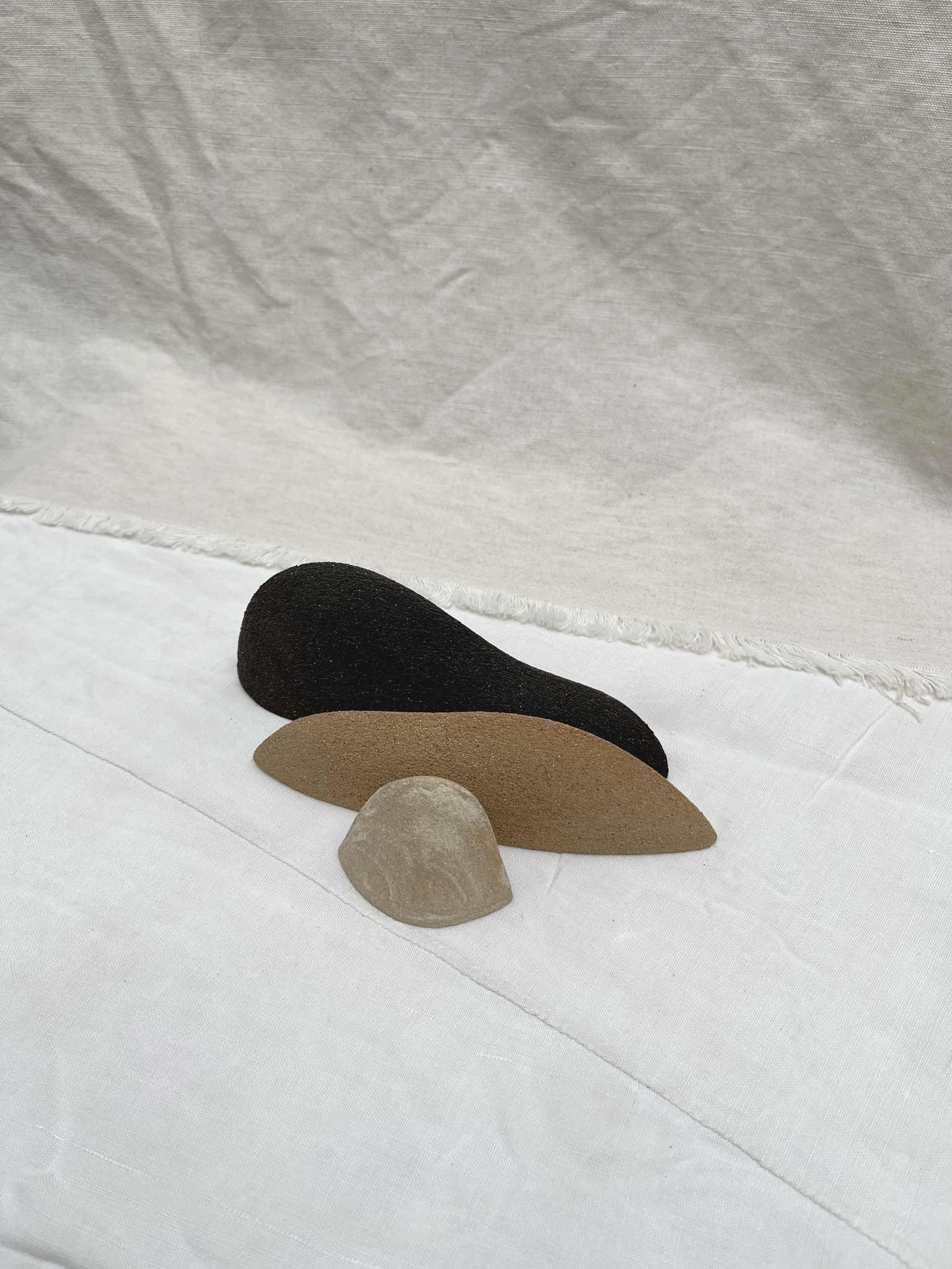 Trio de minis sculptures en grès blanc façonnées à la main à partir de chutes de plaques issues de mes grands formats.