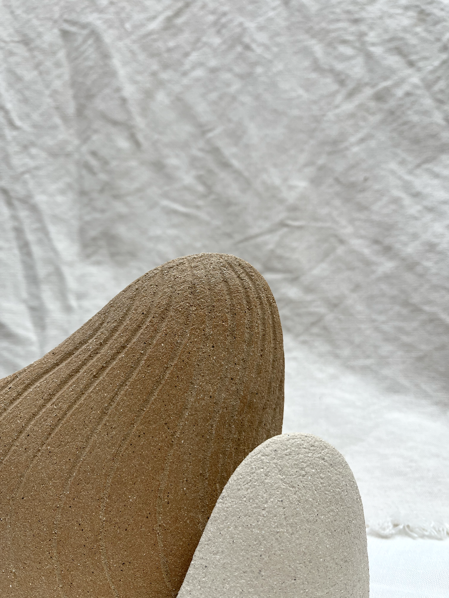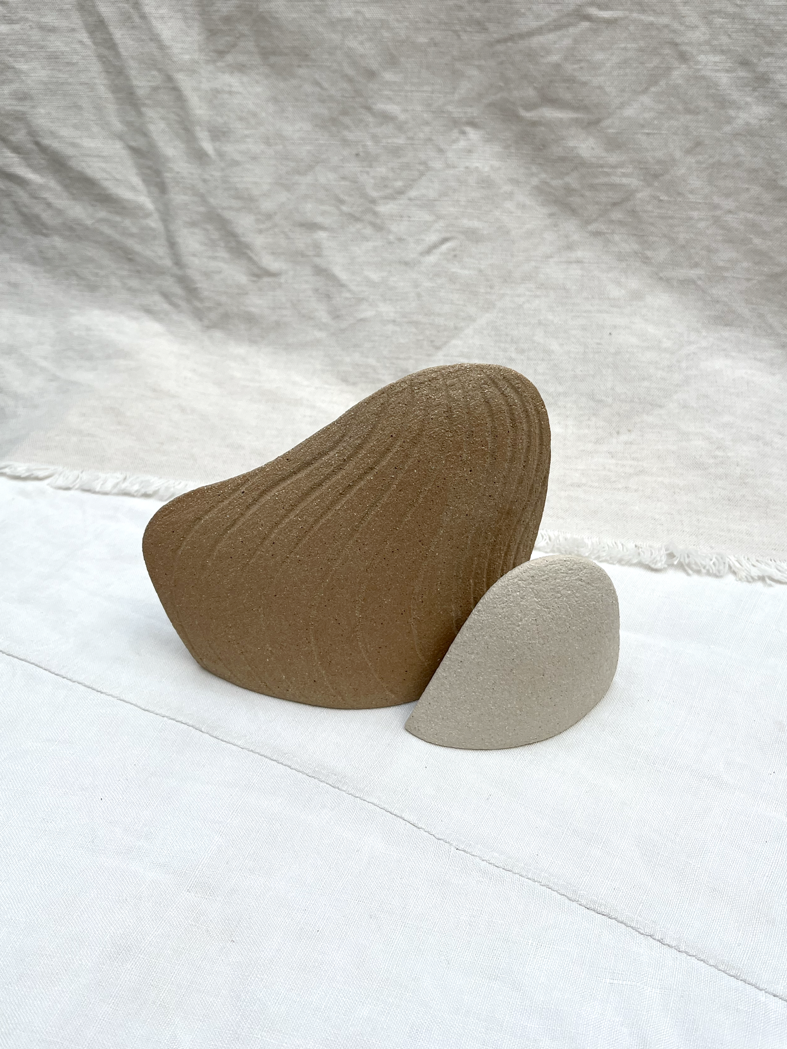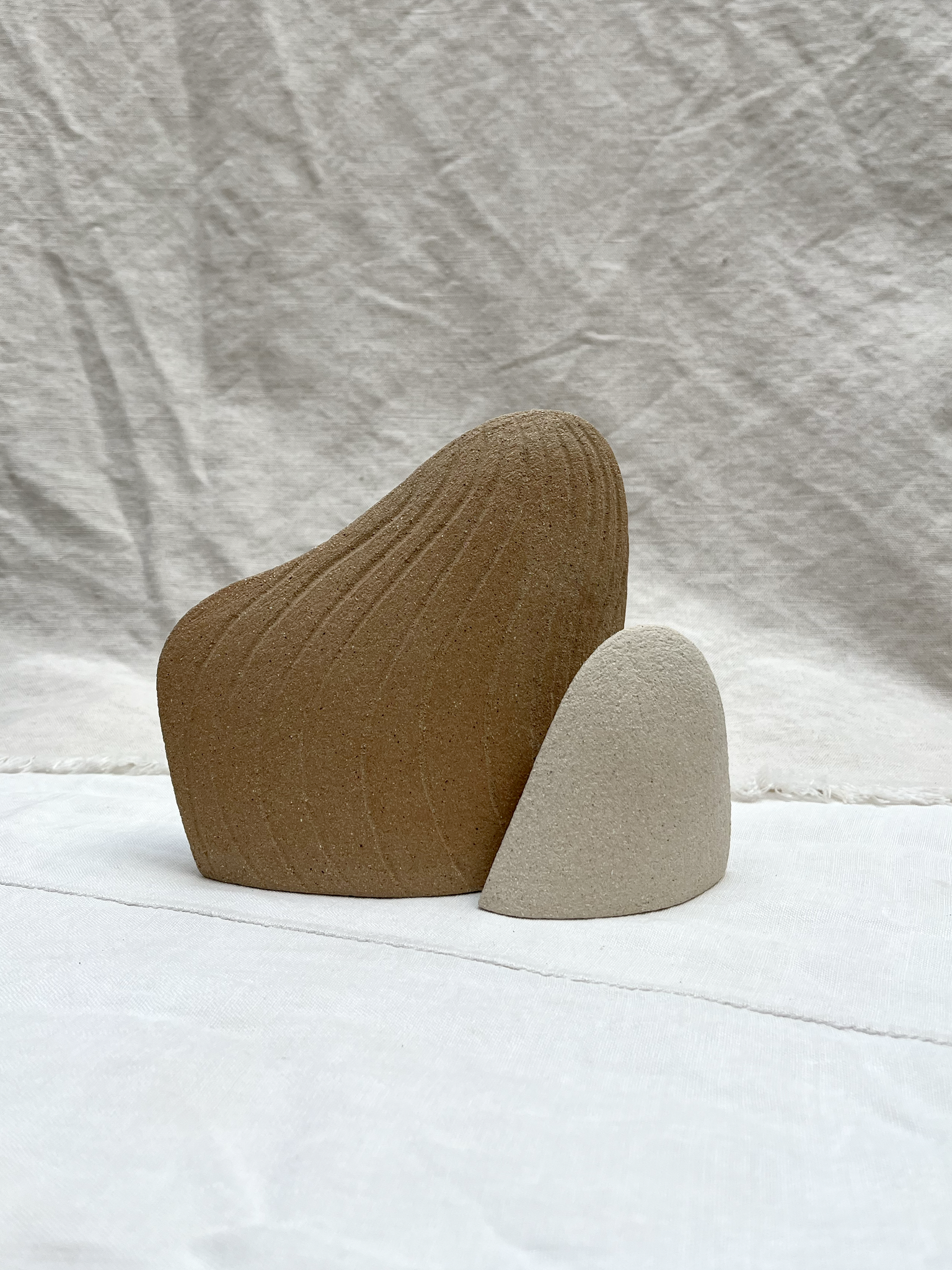 Duo de sculptures en grès blanc et en grès roux, façonnées à la main avec la technique de la plaque.